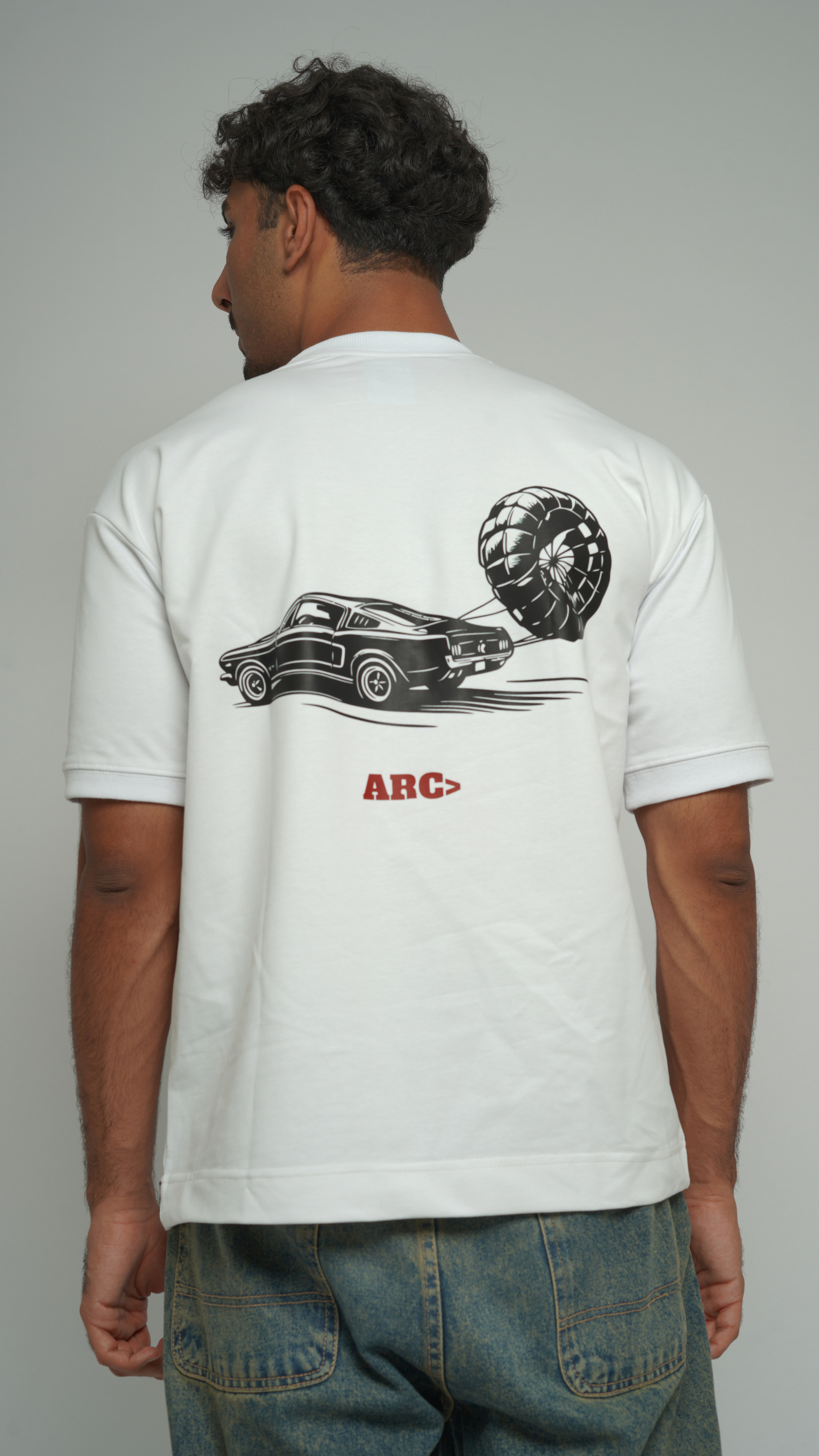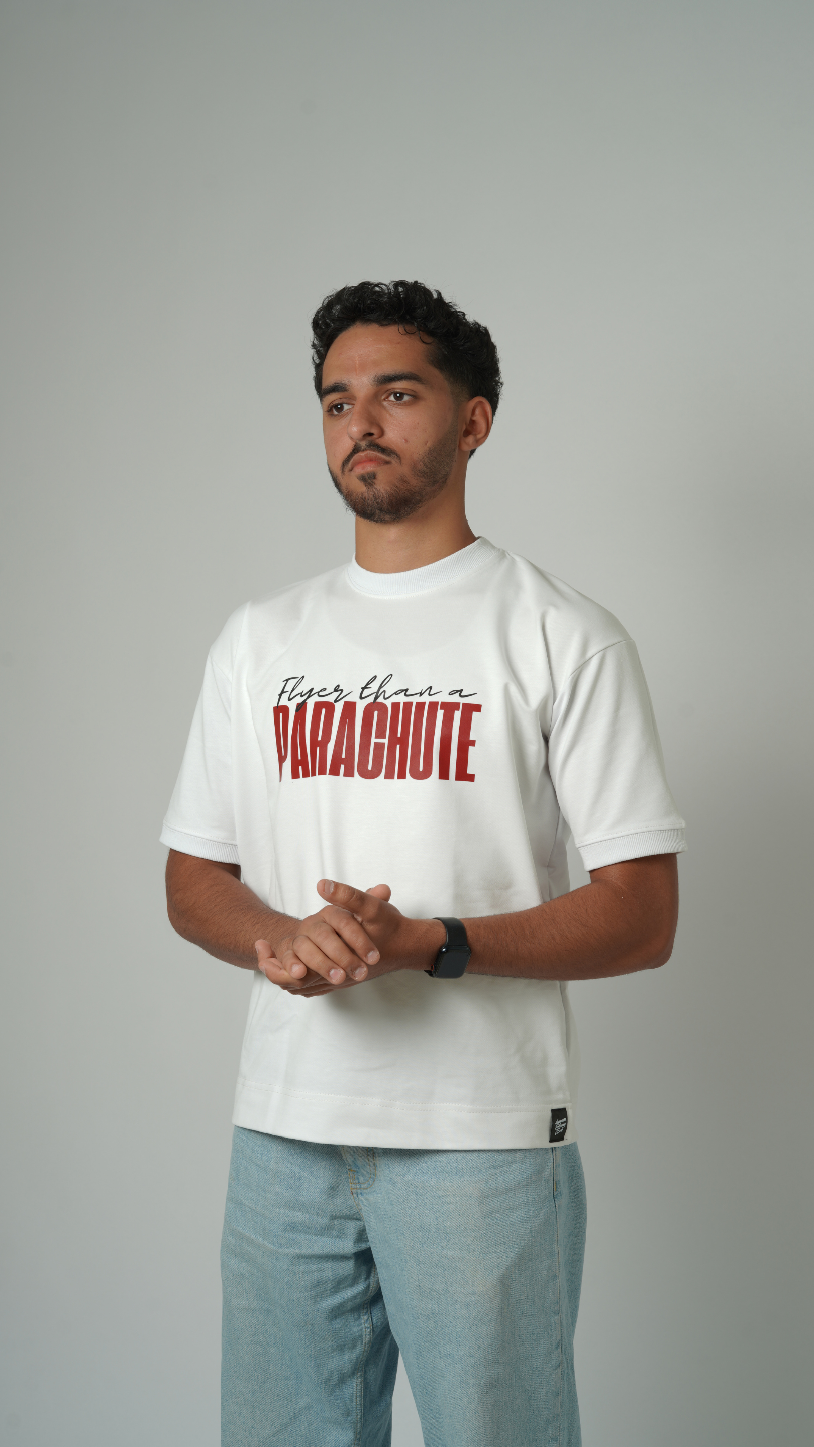 The "Flyer Than a Parachute" drop is where attitude meets motion — loud on the chest, slick on the back. Featuring a bold statement up front and a black muscle car dropping 'chute on the back, it’s a tribute to speed that doesn’t apologize.